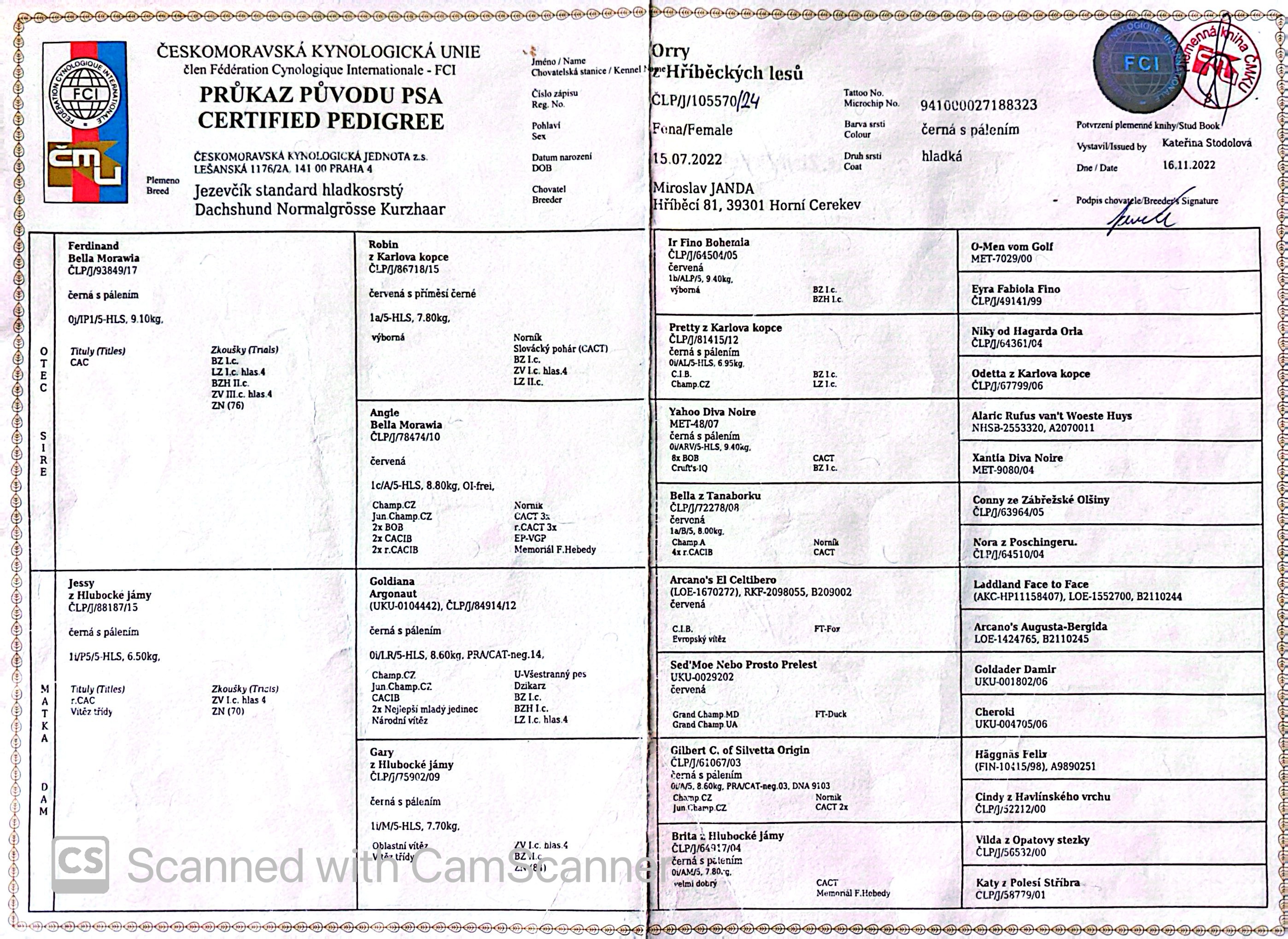 Jako první jsme s Orry absolvovali jarní svod loveckých psů, kde byla dobře hodnocena. Byl to jeden z prvních kroků k její chovnosti. Dále jsme dne 28.10.2023 absolvovali Krajskou výstavu všech plenem - Kelč - Provodovice, s klubovou OV jezevčíků, kde Orry byla jako patnácti měsíční fenka hodnocena známkou VD 2. Dále jsme zde absolvovali bonitaci, ve které byla Orry vybrána jako kandidát chovu. Dne 18.05.2024 Orry absolvovala zkoušky vloh, kde obstála v II. ceně s počtem bodů 159, hlasitost 3. Dne 29.06.2024 Orry absolvovala zkoušky - bezkontaktní norování, ve kterých obstála s počtem 64 bodů. Následně se Orry podrobila genetickému vyšetření krve, díky kterému ji byl stanoven DNA profil. Dne 25.09.2024 Klub chovatelů jezevčíků České republiky uznal Orry jako chovnou fenu.